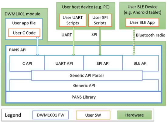 The DWM1001 modules’ firmware contains a proprietary library used to create the Application Programming Interfaces (APIs) with which a user can gain access to UWB nodes. We studied the most convenient API among the four available (see Figure 4):