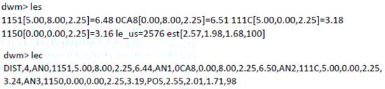 If it has been possible for the tag to calculate the estimated position, by using three or four ranges, then the XYZ coordinates of the tag is given (last four values in response to les or lec commands; see Figure 5). The field “les_us” means the time in microseconds to calculate the location. The last number in the responses is a kind of “quality factor”, which goes from 0 to 100, being a value close to 100 indicative of good quality and less than 50 of bad quality, possibly due to an NLOS condition. A more convenient indication of the quality of estimations would have been a 3 × 3 co-variance matrix for each of the spatial coordinates.