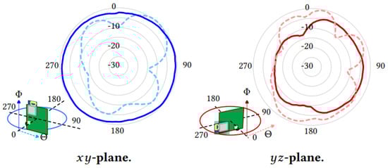 Radiation pattern of DWM1001 antennae in the horizontal (x-y) and vertical (y-z) planes with respect to the long axis of the tag’s enclosure [,].