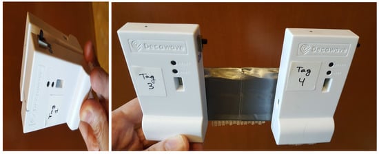Decawave’s UWB evaluation kit (MDEK1001) [], shown in Figure 1, is described by the manufacturer as an “out-of-the-box scalable RTLS network solution.” It consists of twelve DWM1001DEV modules, each of which can be configured as an anchor or a tag; more advance modes (listener and gateway) will be explained later. Devices configured as anchors are intended to be placed in a fixed position in the environment as beacons, and the nodes configured as tag are used on the mobile device that we want to locate. A tag has the ability to measure ranges to various anchors, and locally, each tag can calculate independently its own location using the received ranges to anchors. So that each tag can locate itself, apart from ranges, they receive from the anchors their 3D coordinates; data which are initially calibrated and stored in each anchor. Therefore, the location is private to the tag, and the anchors do not register ranges. Only tags do.