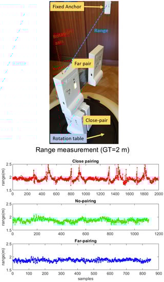 The ranging results shown in Figure 8 suggest that the “Far-pairing” configuration performs in practice as well as a No-pairing solution (one tag alone). We found a range measurement standard deviation of 0.2 m with some bias (blue and red histograms, respectively). However, the “close-pairing” case shows occasionally in-excess range measurements of up-to 0.5 m. It can be observed in the histogram for ranging errors the tail to the right for about 15% of measurements. This range error occurs at specific rotation angles (see the regular pattern of red spikes in the range measurement plot). This confirms that the “Close-pairing” solution is good in 85% of cases, but in the remaining cases doubles the errors because of the occlusion from the neighboring pairing tag.