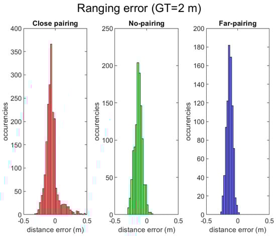 Ranging measurements at 2 m distance from a fixed anchor in LOS conditions. Effect of pairing tags in range errors for: Close pairing (red), No-pairing (green) and Far-pairing (blue).