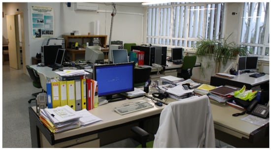 Test environment photo. Laboratory with dimensions of 11.5 m × 6.5 m. It includes a separate room with metallic furniture.
