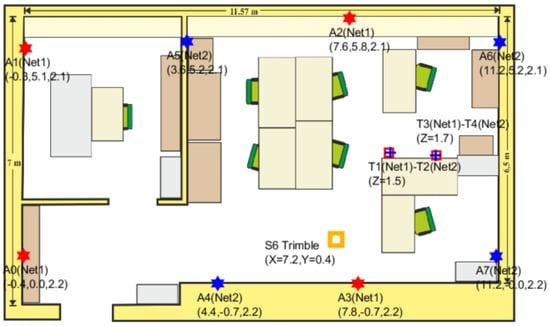 Test environment map-layout. The six-pointed stars indicate the eight anchors distributed in two interleaved sub-networks (Network1 in red, and Network2 in blue). T1-2 and T3-4 are two pairs of tags in static condition. The location of the Trimble S6 total station is marked in orange. The previous Figure 9 is a view of our lab from point A7 (bottom right corner).