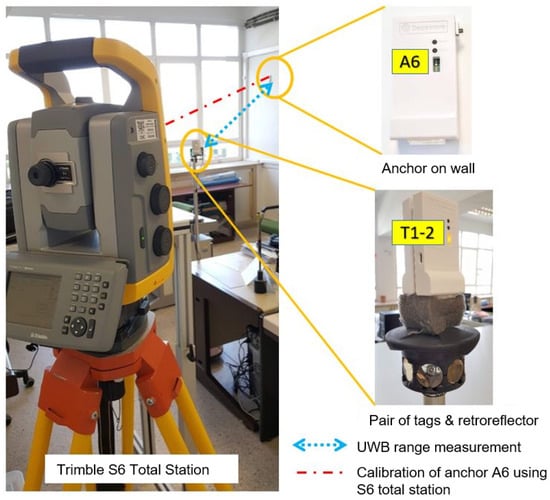 Experimental environment with the precision equipment (Trimble S6 Total Station) to calibrate the position of anchors and to track the tags obtaining the true position or GT (Ground-Truth).
