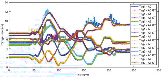 Range estimations between different anchor to tag vs. the GT (ground-truth) range.