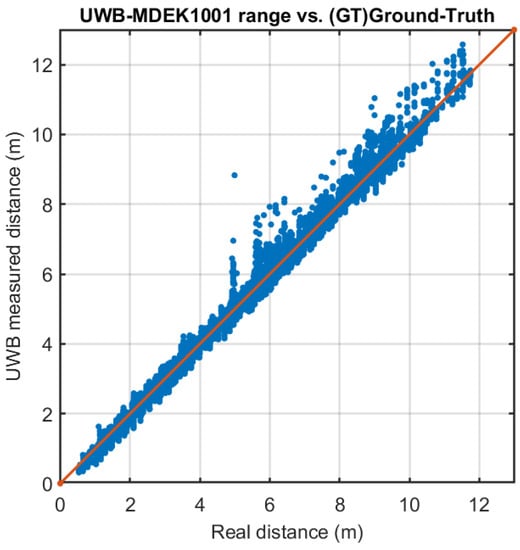 The use of redundant estimation methods is sometimes limited by the use of commercial UWB equipment. Currently, there is a very successful commercial equipment, distributed by the company Decawave, which has many operational advantages for the deployment and use of a network of anchor (devices to be fixed in the environment with known positions) and a set of tags (mobile devices that we want to locate). This system seems to have found widespread use within the scientific community, as a large number of published works use it in their experimental tests. However, this architecture presents a major disadvantage from our point of view: each tag to be located can only measure ranges with a maximum of four anchors. The same Decawave system that is going to be explored in this paper (MDEK1001) was recently studied by Delamare [] and found that using only four ranges was limiting, and they concluded that a larger number of anchors should be used for better accuracy.