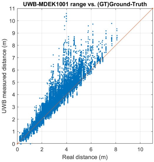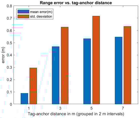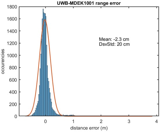 Before presenting the positioning results, in this subsection, we analyze the quality of the individually measured ranges between the different anchors and tags. We want to check the error distribution, the systematic error (bias), the standard deviation of normally distributed range errors, and the presence of outliers.