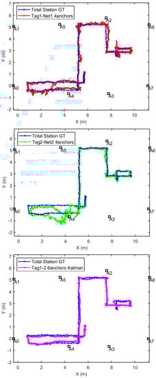 For a second round of dynamic tests, the T1–T2 pair of tags has been placed on a mast, which also includes a 360° retroreflector (Figure 11 right-bottom). This setup allows us to perform free motion dynamic experiments, where the experimentation ground-truth is generated by the total station operating in tracking mode. This Trimble S6 tracking mode of operation performs real-time tracking by automatically commanding tilt and yaw rotations on the S6 head in order to keep tracking the retroreflector (and therefore tracking the tags on the same mast). The accuracy is 1 mm and the 3D position registration is continuous on a logfile at a 1 Hz rate. This method, which is similar to the one employed in [], allow us to record a ground truth (GT) that is used later to make the performance location assessment. The only movement restrictions are that, during the experiment, an LOS condition should be guaranteed so the S6 head does not miss the retro and get lost; also the mast must be kept vertical to guarantee that the x-y position of the retroreflector is the same than for tags.