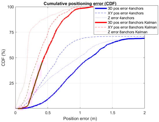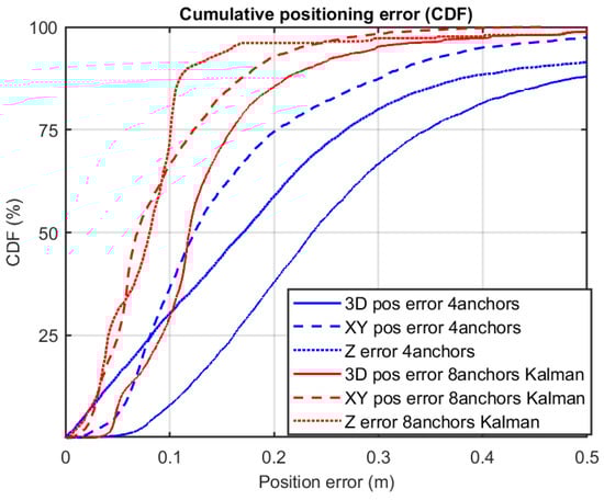 The magenta line in Figure 22 is the output from the EKF that uses all raw ranges available at both tags (up to eight ranges). Thanks to the prediction phase of the filter, we always count with 100% coverage, even when ranges to anchors are below 3 or even no range at all is present. That is not a merit of the proposed pairing process and interleaved anchor networks, but a feature of the EKF filter, as well as the smoothing effect on the trajectory provided by the filter. The important thing to see is if the use of more ranges helps in reducing positioning errors, even knowing that they can arrive from distant anchors. To analyze this, we present in Figure 23 the Cumulative Distribution Function (CDF) of positioning errors.