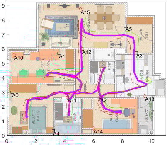The magenta line shown in Figure 16 represents the IMU-based GT used for one of several tests in this scenario. This reference is created by averaging the trajectories of each independent foot. As IMU-based estimation is relative (dead-reckoning), a post-processing is done in order to rotate and translate the origin of the trajectory to the starting point. In all trials, the starting and ending point was the same (Room2, near anchors A10 and A1).