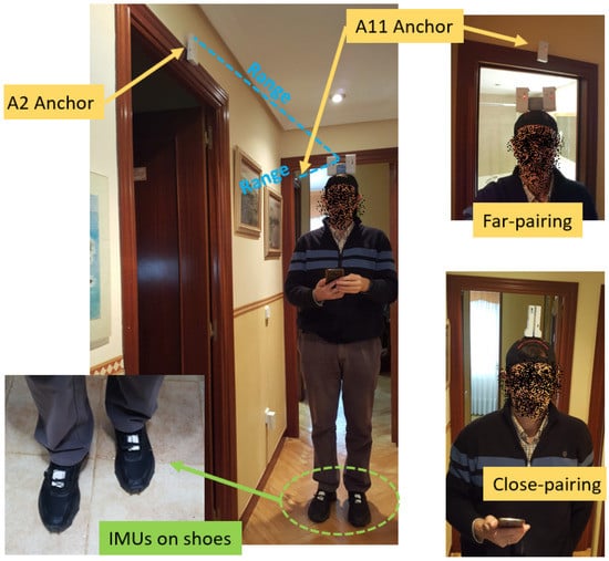 We can see the IMU placement on the shoes of the actor, and other details of UWB tag/anchors installation at the apartment in Figure 17.