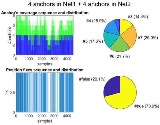 We performed tests with both the far-pairing and close-pairing of tags. In both cases, we used the 12 deployed anchors to cover the complete area, but, as explained before, only eight are detectable at a given time. Thus, the maximum amount of ranges was eight (four from tag1 and another four from tags 2). The typical coverage in the apartment is illustrated in Figure 18. The top-left plot represents the number of anchors under view during a complete session (more than UWB 4000 samples at 10 Hz). Blue and green lines represent the contribution from each of the tags. We can see that the full 8-anchor coverage is almost never fulfilled. However, as we can see in the pie chart (top-right), in 14.4% of the cases, eight ranges are read. In fact, we can read more than four ranges in more than 75% of the cases, thanks to pairing.