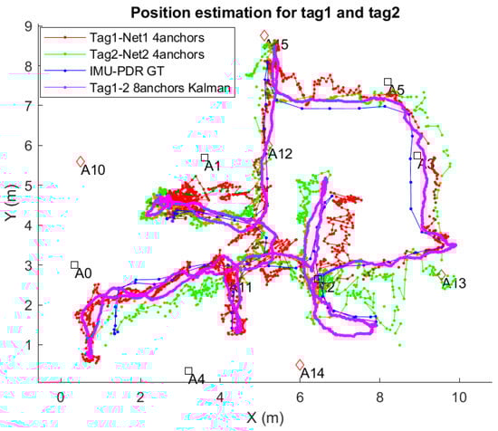 For a first group of tests, we installed, at fixed positions, two pairs of tags in “close-pairing” mode (being each pair able to measure up-to eight anchors). Note that each one of the tags in a pair belongs to a different network. In pair T1–T2, tag1 belongs to Network1, and tag2 to Network2. The same for pair T3–T4. The tags in a pair are stuck together (“close-pairing mode”), so, when attached to a moving person, they move as a single device.