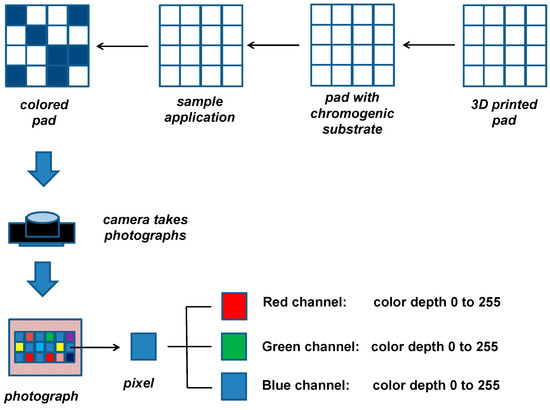 Color depth was determined using the software GIMP 2.10.22 (free and open-source software). The photographs were analyzed in five randomly selected pixels 2 mm from the closest edges, and color depth was determined for red (R), green (G) and blue (B) channels. For 8-bit JPEG photographs, color depth has a value between 0 and 255 for each channel. The final change of color depth was expressed as an average value ± standard deviation. The general principle of the assay and the steps in processing are depicted in Figure 2.