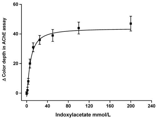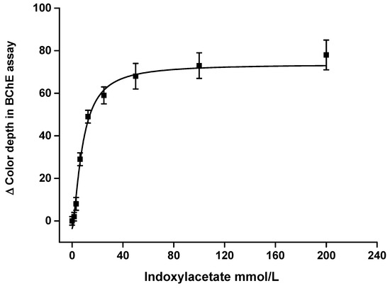 Substrate kinetics were measured using AChE and BChE as enzymes and indoxylacetate as a substrate. The saturation curves are depicted in Figure 3 for AChE and Figure 4 for BChE. The curves were fitted by the Michaelis–Menten equation. Maximal change of color depth for the tested samples was 44 for AChE and 74 for BChE. When using the measuring pad modification, the signal value was half of maximum when 7.0 mmol/L of indoxylacetate was used for the AChE assay and 8.1 mmol/L for the BChE assay. These values can be interpreted as Michaelis-like constants, but it should be reiterated that the concentration and volume were expressed for the indoxylacetate substrate using the measuring pad modification. The sample had four times higher volume (40 µL) than the volume of the applied indoxylacetate (10 µL). A decision was made to use a lower volume of reagents than that of the sample in order to ensure that the surface of the measuring well was covered more homogenously. The concentration of indoxylacetate chosen for the measuring pad modification was equal to 100 mmol/L. Saturation curve results plateaued using that level of concentration, and further increases of indoxylacetate had no significant beneficial effect. For this reason, a concentration of 100 mmol/L was considered optimal for the further experiments.