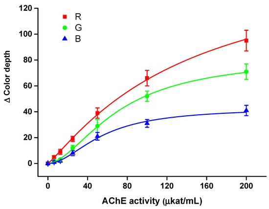 The AChE assay had a detection limit of 4.38 µkat/mL, 11.0 µkat/mL and 14.3 µkat/mL for R channel, G channel and B channel, respectively, and a coefficient of determination (r2) for calibration of 0.998, 0.995 and 0.994, respectively. Relative standard deviation was equal to 10% for R channel, 16% for G channel and 14% for B channel when a sample containing AChE 50 µkat/mL was analyzed.