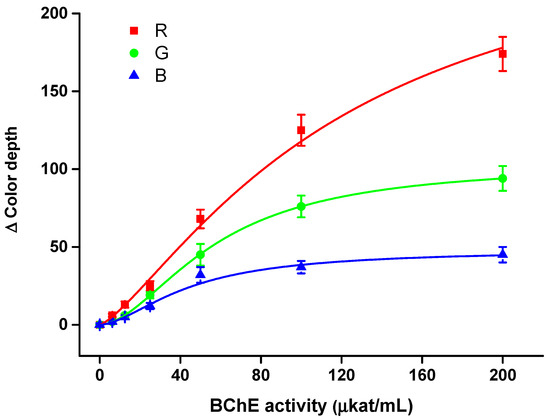 The BChE assay was more sensitive compared with the AChE assay. The best results were obtained using the R channel, where the limit of detection was 4.05 µkat/mL and r2 = 0.989; the G channel’s results were 8.16 µkat/mL and r2 = 0.999, and the B channel’s were 9.10 µkat/mL and r2 = 0.987. The relative standard deviation was equal to 9% for the R channel, 15% for the G channel and 16% for the B channel when a sample containing BChE 50 µkat/mL was analyzed.