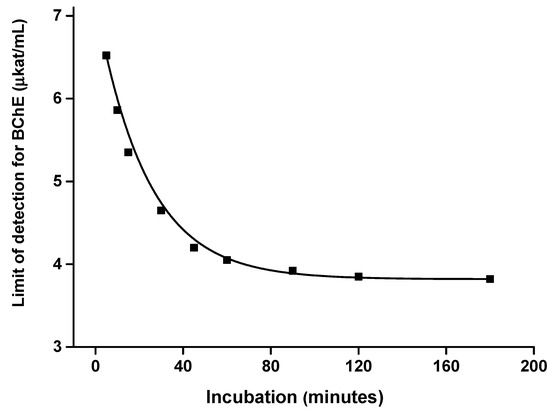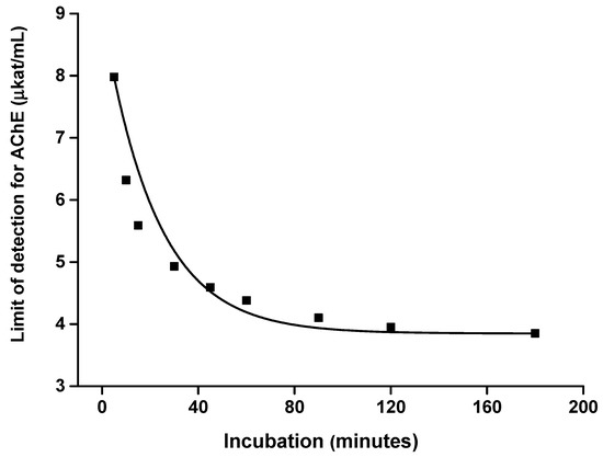 The effect of incubation time on the limit of detection was investigated as well. Calibrations for AChE (Figure 7) and BChE (Figure 8) were done at various incubation times and the limits of detection were expressed against the incubation. Considering these results, an incubation time of up to 40 min has significant effects on the received limit of detection. The plateau of the effect is reached at an incubation time of 60 min. Thus, incubation time of 60 min was chosen as optimal. Illustrative photographs from the experiment are depicted in Figure 9.