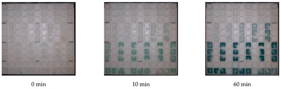 Illustrative photographs showing 42 of the total 121 wells with solutions of 40 µL butyrylcholinesterase (BChE) (0–100 µkat/mL). The measuring pad was photographed in the beginning of experiment, after 10 min and after 60 min.