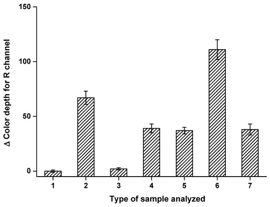 The effect of tetraisopropyl pyrophosphoramide (iso-OMPA) on the smartphone camera-based colorimetric assay and the measuring pad modified with indoxylacetate assay of acetylcholinesterase (AChE), butyrylcholinesterase (BChE) and a mixture of AChE and BChE. Type of sample analyzed: (1) application of saline solution to the well with indoxylacetate and iso-OMPA; (2) 40 µL AChE 50 µkat/mL; (3) 40 µL AChE 50 µkat/mL and 0.1 mmol/mL iso-OMPA; (4) 40 µL BChE 50 µkat/mL; (5) 40 µL BChE 50 µkat/mL and 0.1 mmol/mL iso-OMPA; (6) 40 µL 50 µkat/mL BChE and 50 µkat/mL BChE; (7) 40 µL 50 µkat/mL AChE, 50 µkat/mL BChE and 0.1 mmol/L iso-OMPA. Standard error of the mean is expressed for five independent repeats. R red.