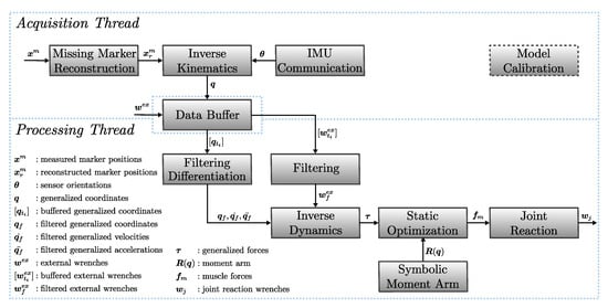 Movement is essential for human well-being, and diseases that affect it can significantly deteriorate life quality. Advances in mobile sensors (Inertial Measurement Units (IMU)), video technologies (markerless Motion Capture (MOCAP)), and traditional marker-based systems are used for real-world assessment of movement [,]. The application of these methods in the analysis of healthy and pathological conditions can be crucial for clinical decision making [,]. Complimenting direct measurements using validated computational models can also provide new sources of information for training and rehabilitation purposes [,]. It is a common practice that such assessments are carried out offline (post-processing after a session) and in dedicated MOCAP laboratories. To this end, we aim to examine the possibility of estimating a multitude of kinematic and dynamic quantities using computational musculoskeletal models in real-time for both in- and out-of-the-lab conditions.
