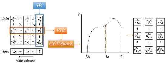 An overview of the filtering and differentiation module. The generalized coordinates from IK are placed into a circular buffer of memory M. The M samples of each signal are filtered using a low pass FIR filter. A generalized cross-validation spline of order is then constructed to evaluate the coordinate and derivatives’ value at time instance .