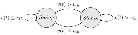 State diagram denoting the conditions required to determine the current gait state. Transitions between swing and stance phases occur by comparing the selected measure with a threshold value .