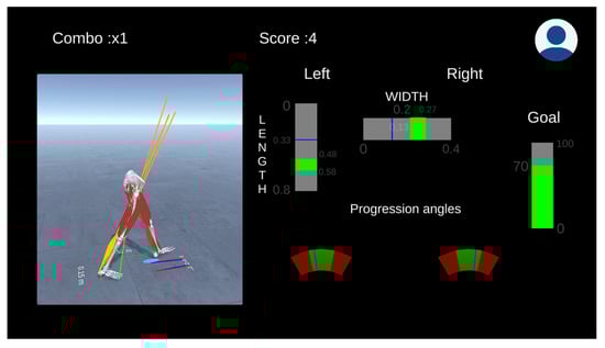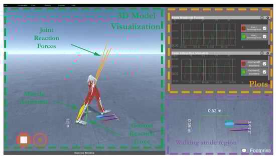 Figure 4 presents the front-end main window. It contains the musculoskeletal visualizer, real-time plotting, and footprint visualization. Within the application, the operator can monitor the logged users’ progress, replay sessions, analyze events, and create new objectives and scenarios. The expert can define a session’s objectives based on values obtained from the back-end, namely foot progression angle, vertical knee joint reaction forces, knee adduction moment, and trunk angle. Once the range and desired values are defined, we can use intuitive visualization primitives such as bar, gauge, or text indicators to provide real-time feedback.