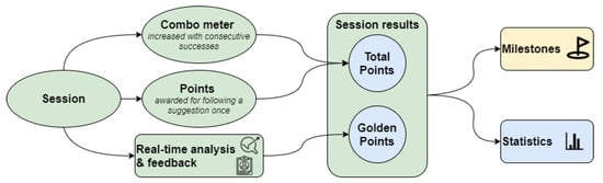 In Figure 5, we present the gamification approach used to engage the user during a train session. The users gather points according to their performance, following the clinician’s objectives during a session. A combo mechanism is used to motivate and encourage users to follow the instructions and maintain the changes throughout the session’s whole duration. Each session, the user is awarded the gathered and golden points calculated based on how well the patient followed the suggestions. Users can monitor their performance on the dashboard, examine key statistics and significant milestones that reflect their progress.