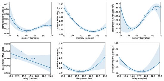 In this subsection, we demonstrate the real-time filter’s performance and outline the procedure for determining the optimal values of its parameters. The filter operates on the generalized coordinates obtained from IK since the optimization may not result in a smooth solution. The mean computational delay of the IK module is less than 0.1 ms. Four parameters, namely the cutoff frequency , spline order , memory size M, and delay D, characterize the filter. The type of movement determines the cutoff frequency. For slow movements like gait, we chose Hz as is the case in most studies [,]. We also fixed the spline order to , a reasonable value to avoid over-fitting. Determining parameters M and D is discussed below.
