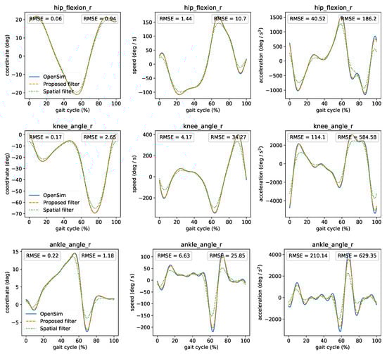 Comparison between OpenSim’s offline kinematics analysis, the proposed, and spatial filters. Left RMSE compares OpenSim’s and proposed filter’s kinematics. Right RMSE compares OpenSim’s and spatial filter’s kinematics. For comparison reasons, we shifted the curves to compensate for the time lag introduced by the filters.