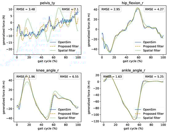 Moreover, we present the effect of online filtering on the calculated generalized forces from ID and why proper filtering is important. In Figure 8 the comparison of the offline ID from OpenSim and real-time ID utilizing the two real-time filters presented previously (proposed and spatial) is illustrated. A comparison of all coordinates is also presented in Supplementary Materials. The time lag introduced by the filters was compensated (shifted) in these plots for comparison reasons. We observed that the real-time results closely match the offline ones. Residual vertical forces at the pelvis are low and within the accepted norm []. The initial part of the proposed filter’s curve is missing because we need at least M samples to begin the processing. The real-time curves are smoother and present fewer oscillations due to the non-causal implementation related to the D parameter. We also observed that the proposed filter outperforms the spatial filter in terms of RMSE. The spatial filter can underestimate the moments due to the kinematic mismatch at the coordinate velocity and acceleration, as presented in the previous subsection. Therefore, this can have a significant impact on the joint moments.