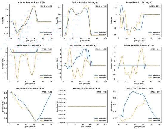 Real-time estimated ground reaction forces, moments, and CoP during gait. Good agreement of the predicted forces, especially on the forward (x) and vertical (y) directions. In contrast, only the x component of the CoP was accurately predicted. Less confluence is observed in the moments.