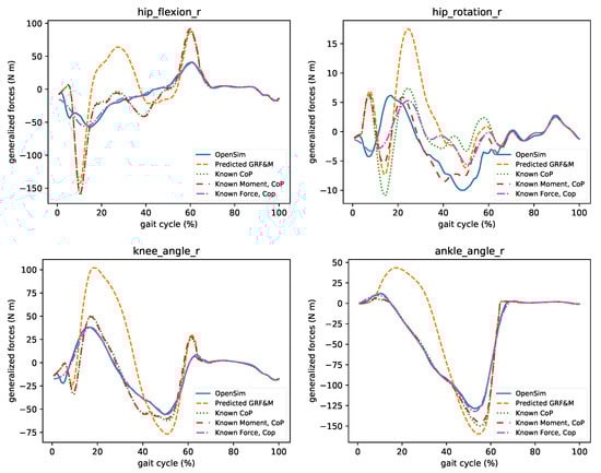The influence of estimated GRF&M on the generalized forces computed through ID. Predicted GRF&M greatly affect the calculated joint moments. A good estimate of CoP improves the predictions of ankle and knee moments. Hip flexion requires accurate estimation of both CoP and forces, while hip rotation CoP and moments.