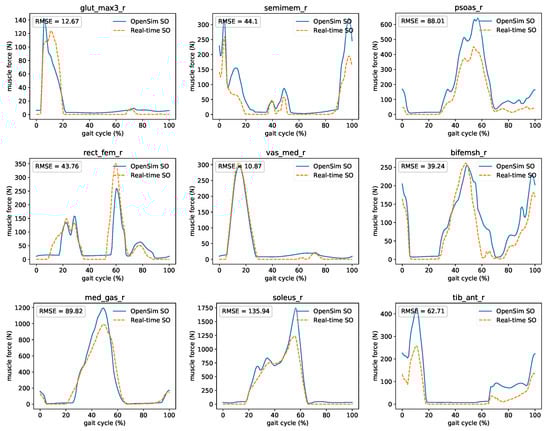 Figure 11 presents the comparison between OpenSim’s Static Optimization (SO) and proposed real-time muscle optimization method. Results show forces for major muscles (gluteus maximus, semimembranosus, psoas major, rectus femoris, vastus medialis, biceps femoris short head, medial gastrocnemius, soleus, and tibialis anterior) of the lower-limb. A comparison of all 92 muscles is presented in the Supplementary Materials. Good agreement between timing and shape matching is observed even though the two methods use different formalization and implementation specifics.