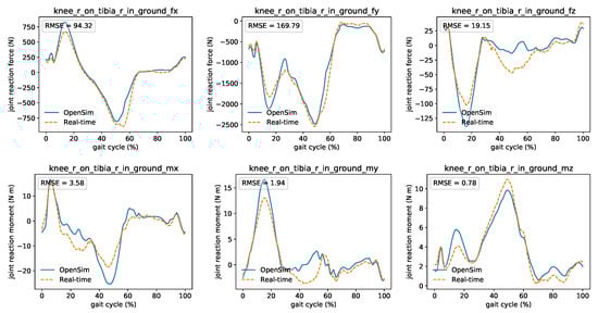 Figure 13. Comparison between OpenSim’s (offline) and real-time’s joint reaction loads (forces and moments) on the knee using the muscle forces obtained by the proposed optimization. For comparison reasons, the curves were shifted to compensate for the time lag introduced by the filter.