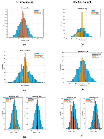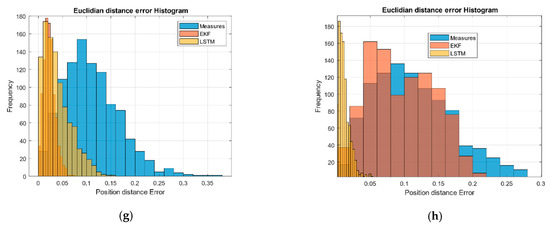 Figure 2g,h shows the system error as a Euclidean distance of the estimated XY positions with respect to the ideal values in order to check the deviation of the filter. All distributions have a tail to the right; however, this metric allows us to highlight the amount of data centered around the zero error. We verified how the performance of the LSTM network for this non-linear system showed great performance as the EKF approached.