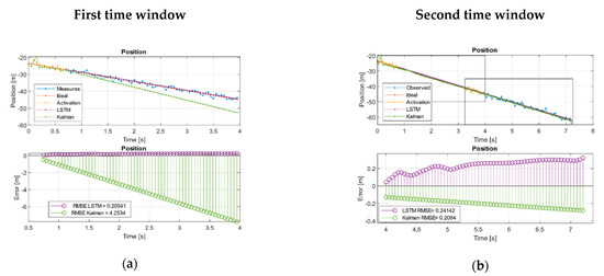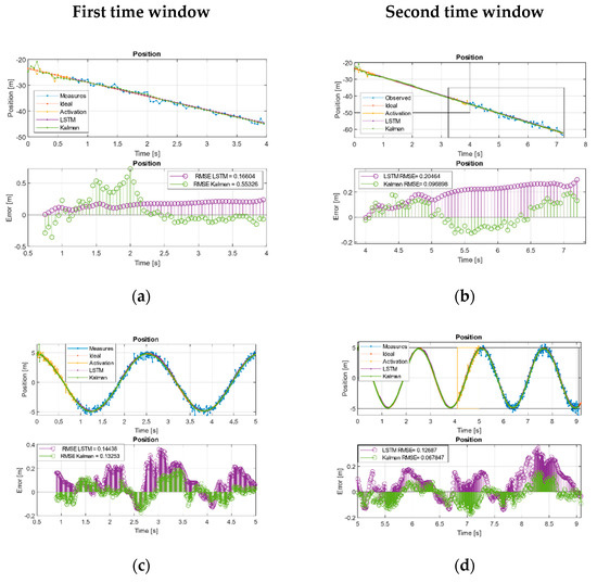 Figure 3a–f and Figure 4a–f show the overlapping regions in yellow—that is, the region without estimates, and is used to activate the networks and also to adjust the KF states in iterative way. After this time, the different systems were fed with new measurements to perform the filtering. In the linear case, this was checked as during the first two time windows, while the KF tended to reduce the RMSE, the network kept the error bounded to acquire the desired trend, Table 7.