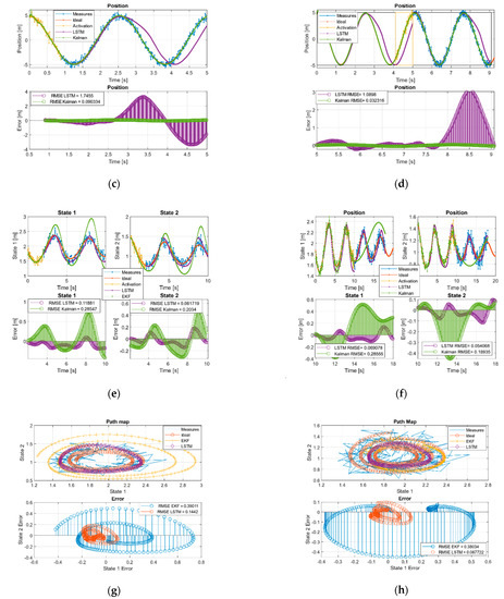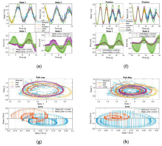 Finally, in the case of the Volterra system, it can be seen how the EKF in the first and second time windows is much more vulnerable and can diverge from the ideal trajectory with respect to the proposed LSTM solution. This is easily observed in each state graphs in Figure 4g,h, especially in the joint state diagrams in error part, where the error of the LSTM is clearly bounded around (0,0) while the EKF is not. Figure 4g,h shows that the EKF was more vulnerable to decoupling in the absence of measurements compared with the neuronal system as observed in the evolution of systems in terms of the amplitude, phase, and finally higher error.
