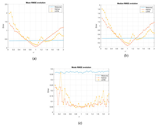 In the sinusoidal case, was considered as the constant term. The general RMSE evolution in the average and median KF showed a linear-symmetric growth, while the network showed an irregular behavior, but with an increasing trend on both sides of α = 1. In the lower region of the measure’s variance, Kalman had a lower value than the LSTM, reaching the border after the LSTM in both sides of the optimum. However, we found a region in the range of [1.25, 1.5] in Figure 5a,b in which the network continued filtering while Kalman did not. To the right of this region, Kalman performed worse than the network. In terms of the RMSE frequency (mode), we can see how both systems for the set of ranges studied were maintained in the filtering region and Kalman generally showed the best performance Figure 5c.