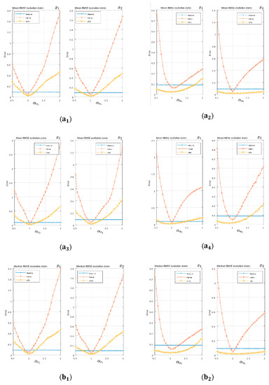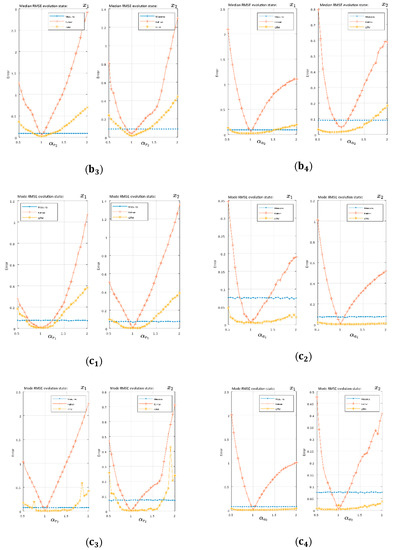 Based on the statistical values of the mean and median RMSE with Volterra’s system trajectory, the EKF sensitivity to changes in the independent terms are shown in Figure 6a,b. The EKF quickly left the filtering region and showed an increasing trend on both sides of the optimum (). On the other hand, the LSTM architecture was much less sensitive to these changes, becoming practically invariant in the second state to modifications. The previous trend was generalized for all terms. The mode of the RMSE in Figure 6c showed the same behavior emphasizing the difference between the EKF and the network with the constant term modifications, where the network with even a slight increasing trend in the edges did not achieve, in the study range, the filtering border.