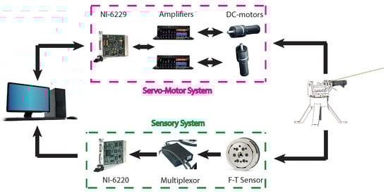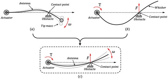 In the last two decades, a robust and compact sensor device has been developed that mimics the antennae that many insects have. This is called a “sensing antenna” and is an active sensor that consists of a flexible link moved by servo-controlled motors and a load cell placed between the beam and the motors. This device replicates the touch sensors that many insects have and carries out an active sensing strategy in which the servomotor system moves the beam back and forth until it hits an object. At this instant, information regarding the motor angles combined with the force and torque measurements makes it possible to calculate the positions of the hit points, which is valuable information about the surface of an object. A 3D map of the surface of that object can then be obtained, which allows its recognition. The design of efficient artificial sensing antennae has been addressed by several researchers, as in [], in which issues such as the minimum number of sensors required and the precision attained using antennae with different profiles (cross- sections and curvatures) were studied.