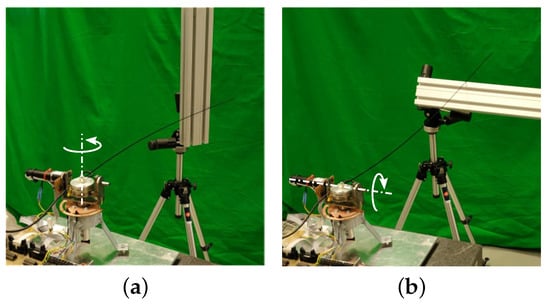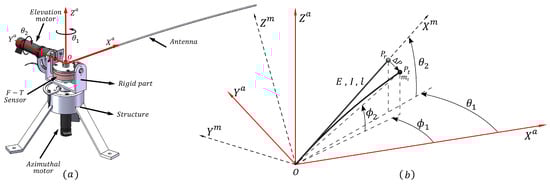 The experimental prototype is a two-degrees-of-freedom (2DOF) robotic system with a single flexible link, which is used as a sensing antenna in haptics applications, shown in Figure 2a. Its structure is made of stainless steel, with three legs to ensure perfect stability. The flexible link is attached at one of its ends (denoted as the absolute origin O) to two direct current (DC) mini-servo actuator PMA-5A motor sets that include harmonic drive reduction gears. One servo-motor rotates the system with azimuthal movements, whereas the other rotates the system with elevation movements. These DC motors have incremental optical encoders that measure the angular position of the motors and , which are the azimuthal and attitude joints, respectively. The system also has a force-torque (F-T) sensor located at the origin O, which allows the measurement of the Cartesian coupling force and torque existing between the link and the servomotor structure. The signals are acquired through the use of gauges located inside the sensor, which are multiplexed and amplified in order to send the information regarding forces and torques to the data acquisition card (DAQ). The servomotor structure, which rotates according to the motor angles, holds the F-T sensor and the flexible beam that is attached to one of its two sides. More information about this platform can be found in [].