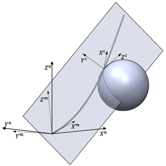 A third frame, , is defined from the force measured by the F-T sensor at the point at which the antenna touches the surface of an obstacle at a certain point of the antenna at a determined instant: (1) the axis is the direction of the reaction force of the object on the antenna; (2) the axis is perpendicular to and to the vector (see Figure 2b); and (3) the axis is perpendicular to the other two axes. Figure 3 shows all the frames and the relations among them.