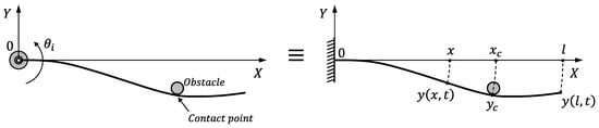 Equation (2) holds because a linear dynamic system is assumed. Since the superposition principle is applied, the transient can be obtained from Equation (3) by assuming that the base end of the link is clamped to the motors and the point at which the link comes into contact with the object is aligned with the direction of the base end of the link, i.e., with . The following contour conditions must, therefore, be taken into account in order to solve Equation (3) []: