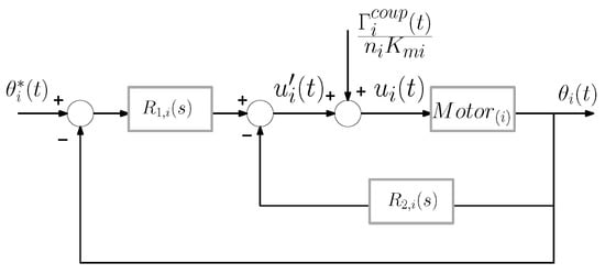 where is the motor torque, is the input voltage to the motor, and are the acceleration and velocity of each motor (where is the angle of the motor i), is the moment transmitted by the actuator to the link and is the Coulomb friction term, which is non-linear.