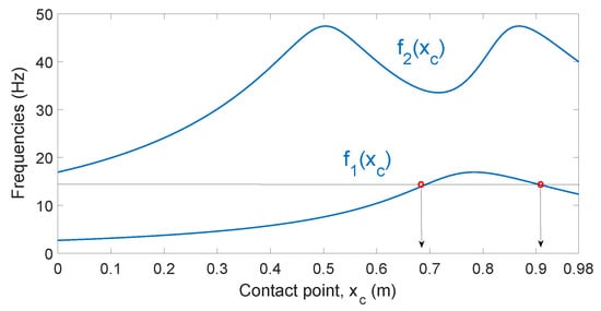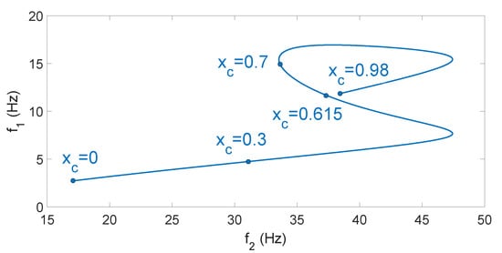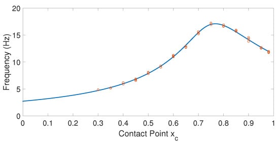 Our method estimates the contact point using the first natural frequency of the transient response, which is obtained from Equation (6). If there were two possible contact points for a given vibration frequency, the true point would be discriminated by using an estimator based on the steady state, which utilizes the measurements of Equations (12) and (13). It is important to note that the angular positions of the motors are controlled throughout the process.