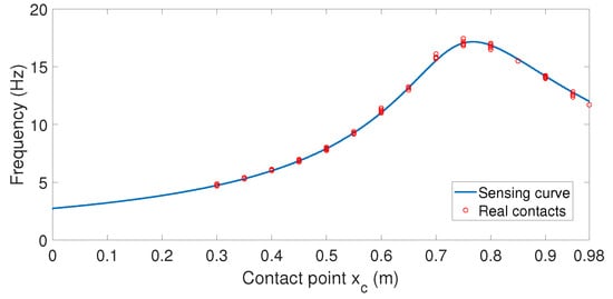 The first research on this subject implemented a sensing system composed of a flexible link that moved on a horizontal plane, a torque sensor, a joint position sensor, a rotational actuator and a payload at the tip end of the link. In [], this setup was used to determine the contact point of the antenna by measuring the lowest natural frequencies of the oscillations of the link during contact mode. A schematic representation of this methodology is shown in Figure 1a. It was proven that the contact position cannot be determined if only the fundamental natural frequency of the beam is taken into consideration. It was subsequently shown that the information regarding the fundamental and the second natural frequencies is sufficient to determine the contact point, provided that: (1) the link has a uniform mass and stiffness distributions; and (2) a light payload is added to the endpoint of the antenna in order to avoid indeterminacy in the estimation of some points of the link. The frequencies are then mapped onto a contact-point coordinate function. Experiments demonstrated that this is a very useful sensing strategy and reported estimations of the contact point of the link with relative errors of about of the length of the antenna.