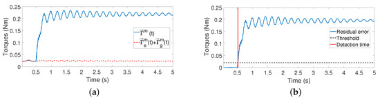 Estimation of the instant of contact: (a) Measured and estimated coupling torques; (b) residual error.